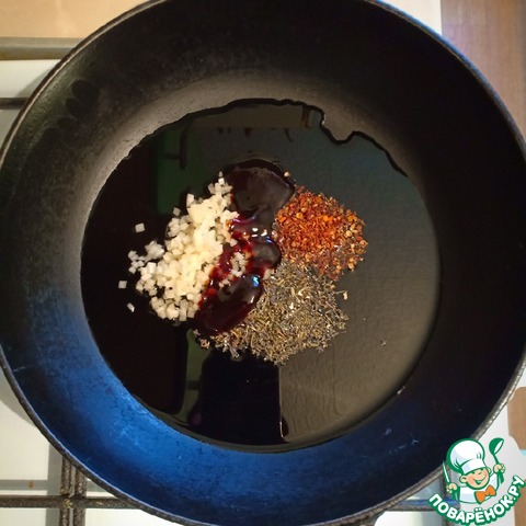 В хорошо разогретую сковороду налить немного растительного масла, добавить терияки, базилик, перец и чеснок.