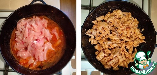 В этом же соусе обжарить кусочки курицы до готовности, также слегка присолить, если в сковороде масла немного, добавить еще.