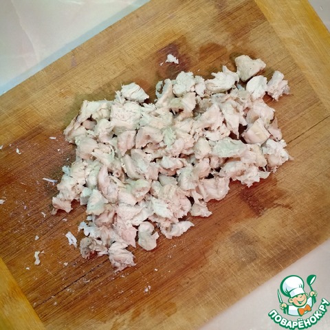 Готовую курицу вынуть из бульона, немного остудить и нарезать мясо небольшими кусочками.