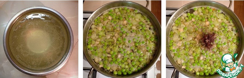Бульон процедить, поставить обратно на огонь, добавить нарезанное мясо, зеленый горошек, брокколи, картофель и спасерованные овощи, поперчить. Дать супу закипеть, затем огонь немного убавить и варить 10-15мин, затем огонь выключить и дать супчику настояться.