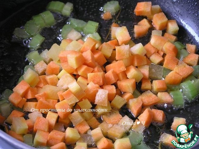 В сковороду добавить оставшееся масло, выложите 2-3 веточки тимьяна, обжарьте 1-2 минуты, добавьте нарезанный сельдерей, продолжая обжаривать.
