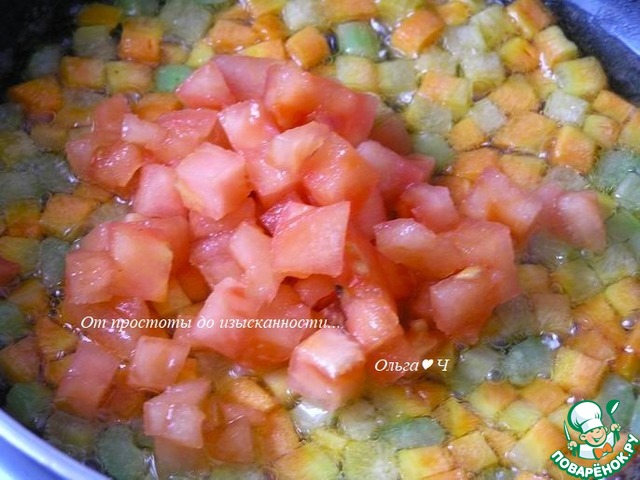 Помидор очистите от кожицы, нарежьте кубиками, добавьте к остальным овощам, перемешайте.