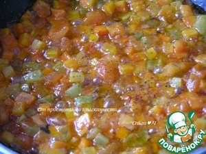 Затем влейте томатную пасту, смешанную со столовой ложкой воды, перемешайте, тушите 3 минуты.