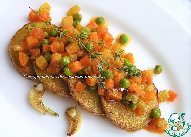 Картофель разложите по тарелкам, сверху выложите овощное рагу, украсьте веточками тимьяна.