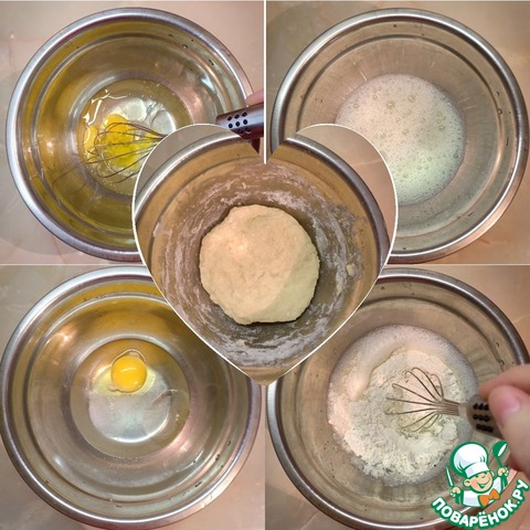 Приготовить тесто: в миску вылить теплую воду, разбить в нее яйца, добавить соль и растительное масло. Перемешать до полного растворения соли. Постепенно всыпать просеянную муку и замесить тесто. Месить тесто около 10мин до эластичности (внутри не должно быть пузырей воздуха), затем отложить тесто на 30мин, чтобы клейковина разбухла.