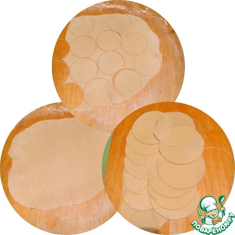 Тесто раскатать в тонкий пласт (чем тоньше, тем лучше) и стаканом или металлической формой вырезать одинаковые кружочки.
