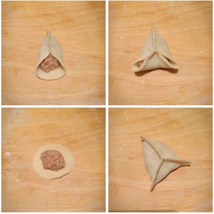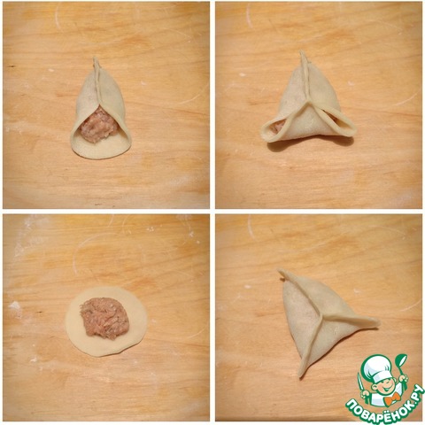 Разложить начинку и слепить пельмени любой, удобной для вас формы.