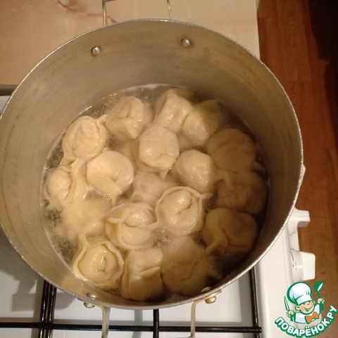 Варить пельмени в бульоне или просто в воде 5-7мин. Перед подачей полить растопленным сливочным маслом или сметаной, посыпать свежей зеленью.