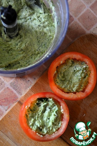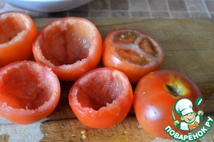 У помидоров срезать крышечку. Осторожно чайной ложкой выскрести мякоть.