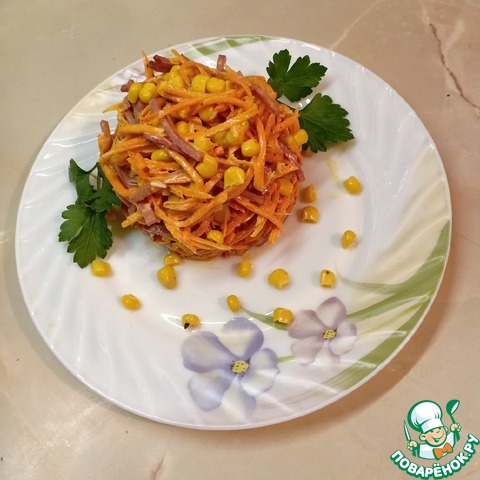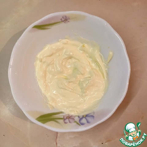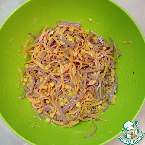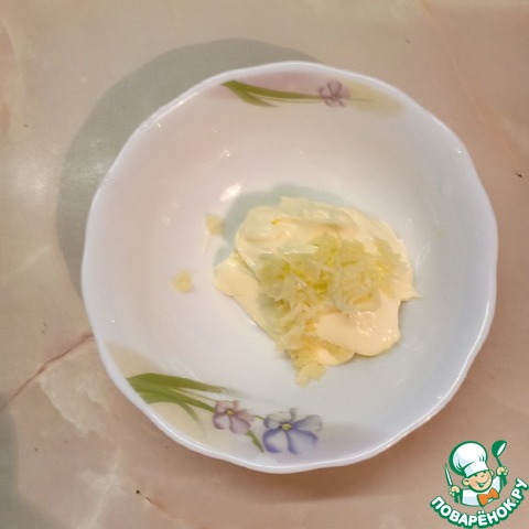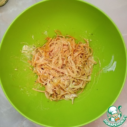 Чеснок очистить, пропустить через пресс и смешать с майонезом. Морковь по-корейски выложить в глубокую миску, смешать с майонезно-чесночной смесью и дать постоять 30мин.