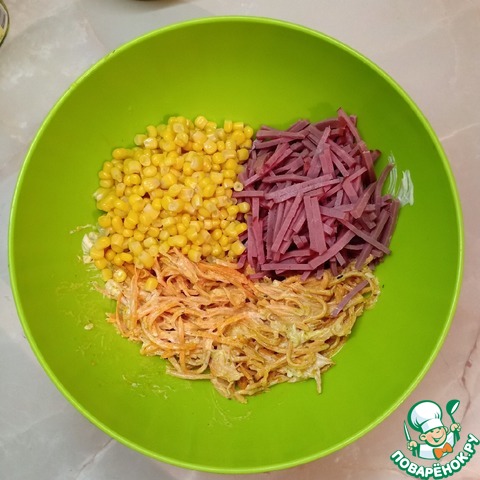 Из банки с кукурузой слить жидкость. Затем в глубокой миске смешать все ингредиенты.