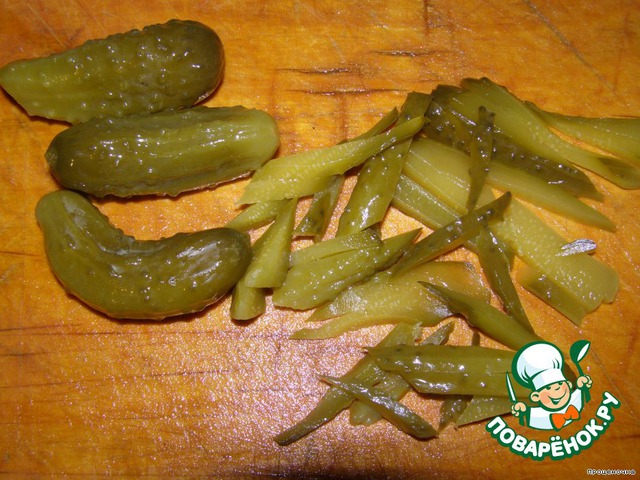 Соленый огурец тоже нарезать ломтиками, добавить к основной массе