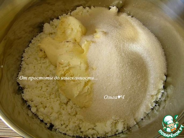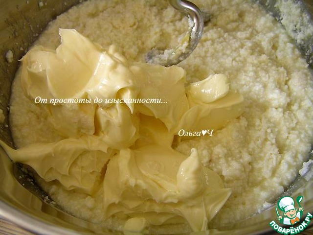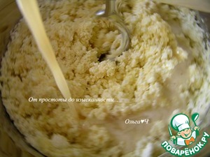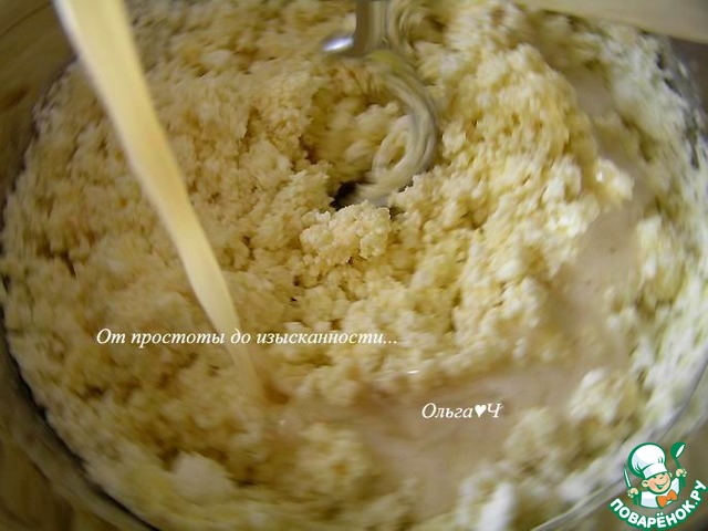 Затем тонкой струйкой влейте в творожную массу, постоянно помешивая (я это делаю в планетарном миксере с насадкой "крючки").