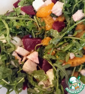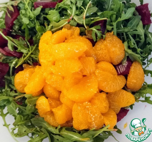На руколу выложить кусочки свеклы и дольки апельсина.