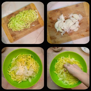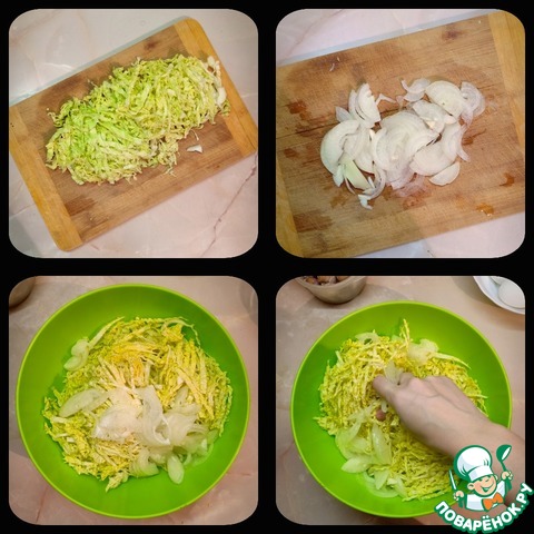 Капусту и лук мелко порезать, посолить. Затем капусту тщательно размять руками, чтобы она пустила сок, дать немного постоять.