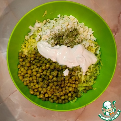 Яйца и горошек выложить в миску с капустой, добавить сметану или майонез, перемешать, украсить рубленной зеленью.