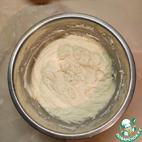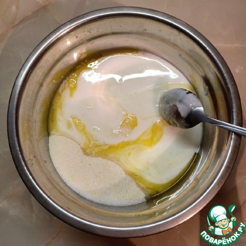 Растопить сливочное масло, затем немного остудить и смешать с манкой, сахаром, солью и кефиром.