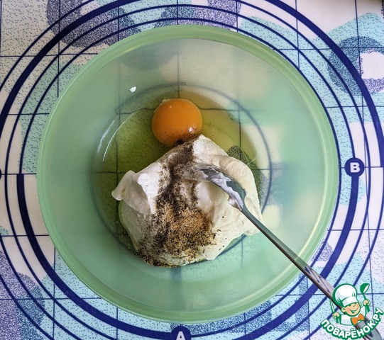 Смешать творог с я яйцом и приправами, я делаю это ложкой.