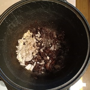 Затем добавить нарезанные лук и чеснок, слегка поперчить и жарить до готовности лука на среднем огне.