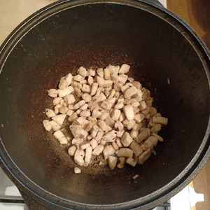 Кусочки мяса выложить в казан и обжарить на растительном масле до готовности на сильном огне до появления легкой румяной корочки.