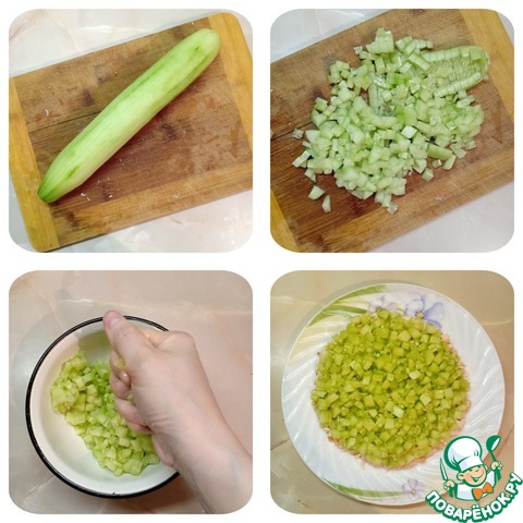 2 слой - огурцы помыть и очистить от шкурки. Порезать соломкой или кубиками, слегка отжать от лишней жидкости и уложить на слой мяса.
