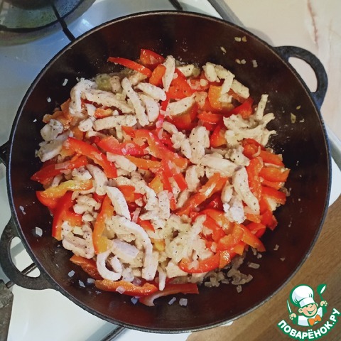 Затем добавить нарезанное куриное филе, прогреть 5-7мин, затем выложить нарезанный перец. Посолить и поперчить, готовить еще минут 7-10, периодически помешивая.