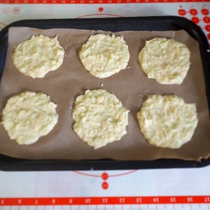 Из сырно-кабачковой массы сформовать ложкой тонкие лепешки. На противень обязательно постелить пергамент хорошего качества. У меня получилось 10 лепешек.