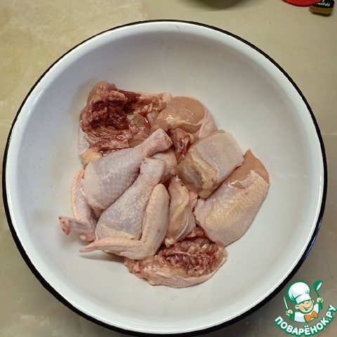 • Курицу помыть и разделать на порционные кусочки, натереть солью со всех сторон и выложить в форму, смазанную маслом, шкуркой вверх.