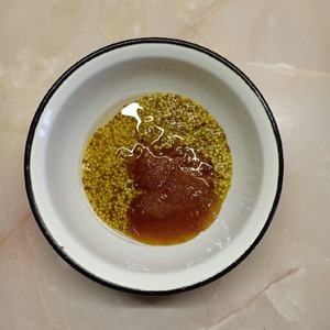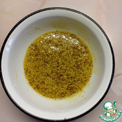 • Венчиком взбить горчицу, мёд и масло до однородной консистенции, посолить и поперчить.