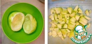 Кабачок помыть, разрезать пополам, очистить от кожуры, вынуть ложкой семена и волокна. Края кабачка ровно обрезать. Обрезки кабачка покрошить средними кубиками.