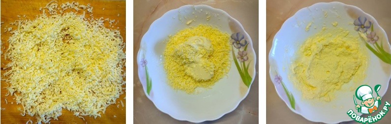 Сыр натереть на мелкой терке и смешать с майонезом до однородности.