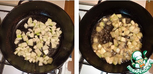 Кусочки кабачка обжарить до золотистой корочки в той же сковороде.