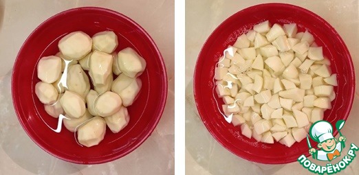 Картофель помыть, почистить и нарезать крупными кубиками.