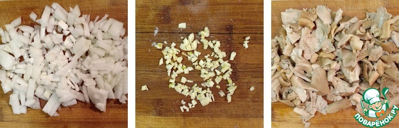 Лук и чеснок почистить и мелко покрошить. Грибы нарезать произвольными кусочками.