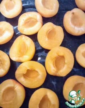 Разрезать каждый абрикос на две половинки и удалить косточки.