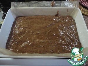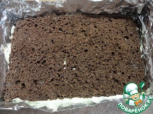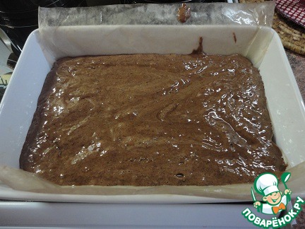 К желткам подсеять смесь сухих ингредиентов и все перемешать лопаткой. Сверху выложить белки и осторожно перемешать. Тесто вылить в прямоугольную (у меня 16 х 26 см) или квадратную форму, выстланную бумагой для выпечки, и поставить в духовку на 25 минут. Дать полностью остыть в форме.