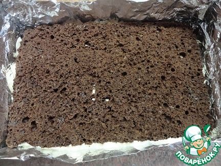 Бисквит разрезать на три коржа. Нижний положить на блюдо и поставить вокруг бортики из фольги. На первый корж выложить 1/3 часть крема.