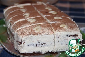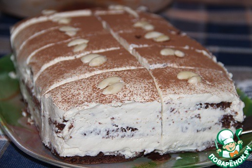 Перед подачей посыпать порошком какао и украсить лепестками миндаля.
