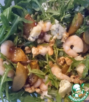 Салаты из королевских креветок - это уже интересно. Но салат из карамельной груши, креветок, сыра Дорблю и грецких орехов, выложенных на листья рукколы, заправленный медом, горчицей и лимонным соком поразил меня своим насыщенным и экзотическим вкусом. Не сомневаюсь, что этот салат будет замечен на Вашем столе.