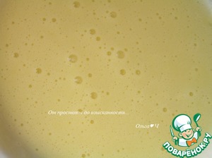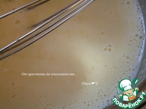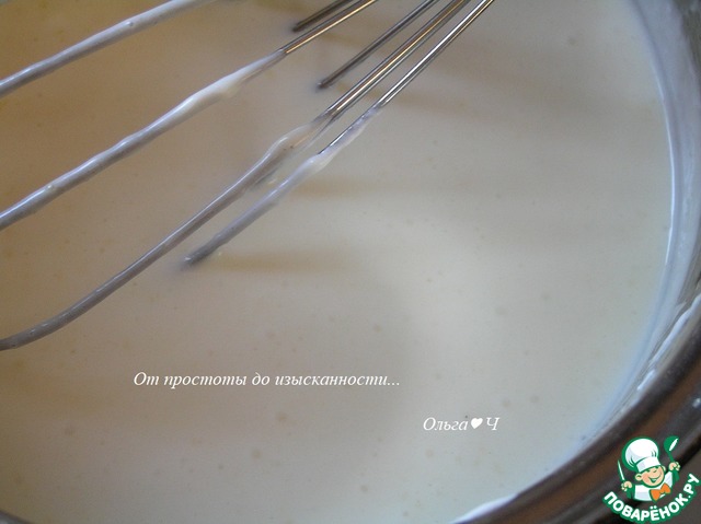 Продолжая взбивать, тоненькой струйкой влейте горячее молоко.