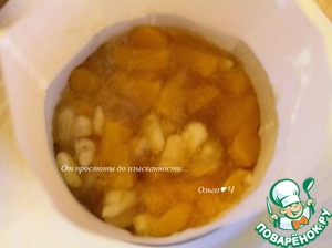 Приготовьте желе. Желатин замочите в воде и дайте набухнуть. Фрукты нарежьте маленькими кубиками, не более 1 см. В небольшую кастрюльку с толстым дном налейте сок апельсина и лайма, добавьте сахар и фрукты. Все доведите до кипения и снимите с огня. Добавьте желатин и перемешайте до его полного растворения.*** Будущее желе отставьте в сторону и, пока будете делать мусс, просто время от времени помешивайте его, чтобы желе не схватилось.***