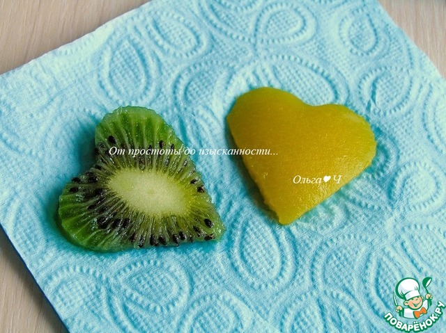 Аккуратно достаньте пирожные из колец, снимите бумагу. Из кусочков киви и манго вырежьте сердечки, обсушите на салфетке.