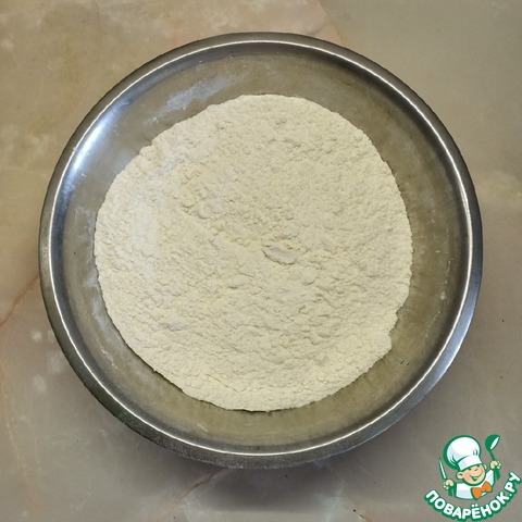 Смешать пшеничную муку с разрыхлителем.