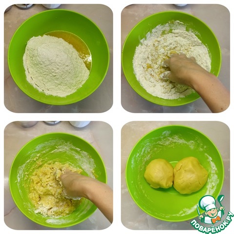 Постепенно ввести мучную смесь в полученную в миске массу. Замесить крутое тесто и разделить его на две неравные части. Меньшую часть положить на час в морозильник.