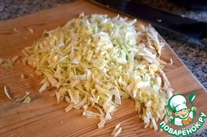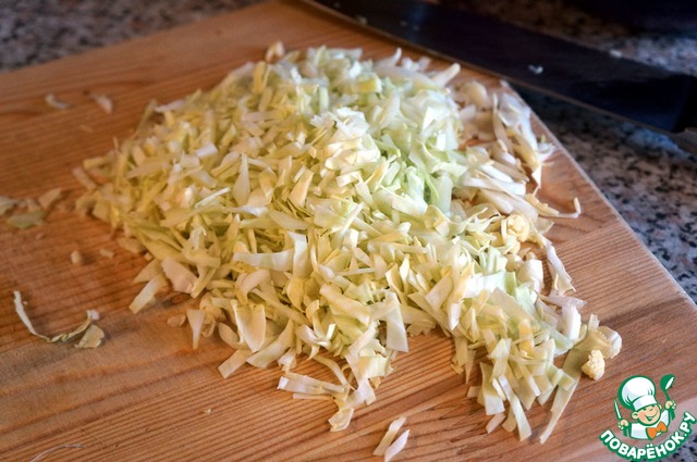 Капусту нашинковать очень тонко. Сложить в миску, немного присолить, помять руками, чтобы дала сок.