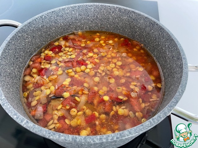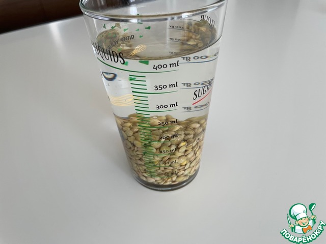 В первую очередь заливаем чечевицу холодной водой, пока будем подготавливать остальные продукты, она настоится.