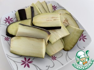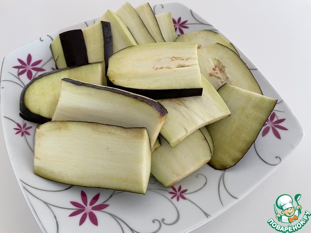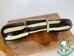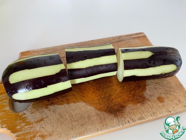 Баклажан моем и полосками снимаем шкурку (полностью чистить не нужно). Если баклажан большой, делим его на три равные части, если поменьше, то соответственно на две части.