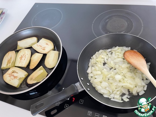 Обжариваем пластины баклажанов с двух сторон на растительном масле. Обжариваем нарезанный лук.