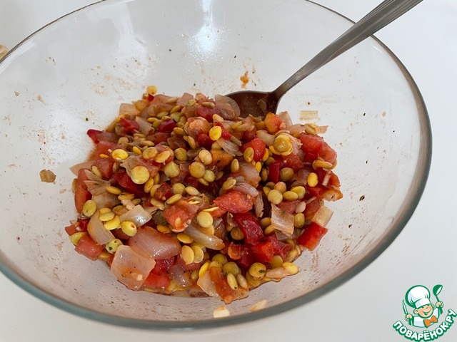 В емкости смешиваем измельченный чеснок, мелко нарезанные помидоры и перец. Добавляем томатную пасту и обжаренный лук. Чечевицу откидываем на дуршлаг и тоже отправляем в емкость с овощами. Солим, перчим и добавляем любимые специи. (У меня: черный и красный перец, сушеная мята, молотая зира.) Если Вы баклажаны и лук не обжаривали, можно добавить 2 ст. л. растительного или сливочного масла.