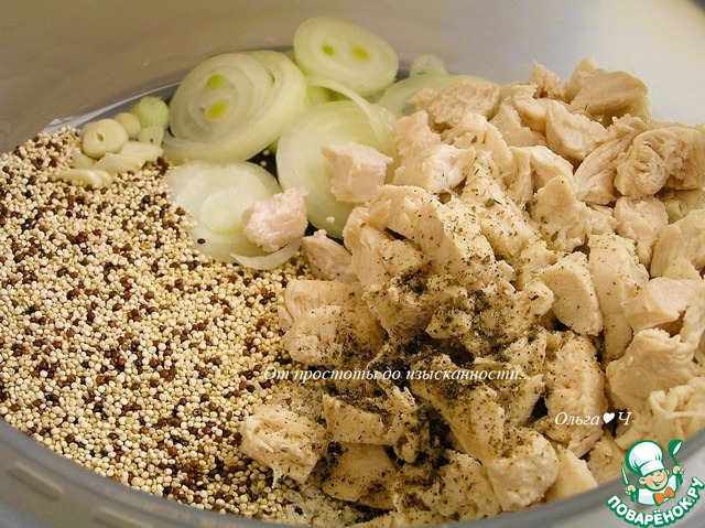 Дайте остыть, затем нарежьте на маленькие кусочки и выложите в чашу для супа пароварки вместе со всеми соками со сковороды. Добавьте киноа, чеснок, нарезанный дольками, и лук, нарезанный кольцами. Посолите, поперчите.